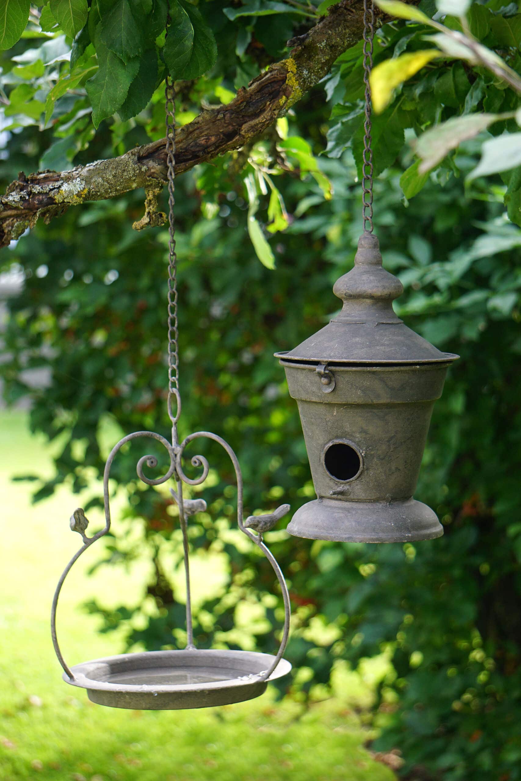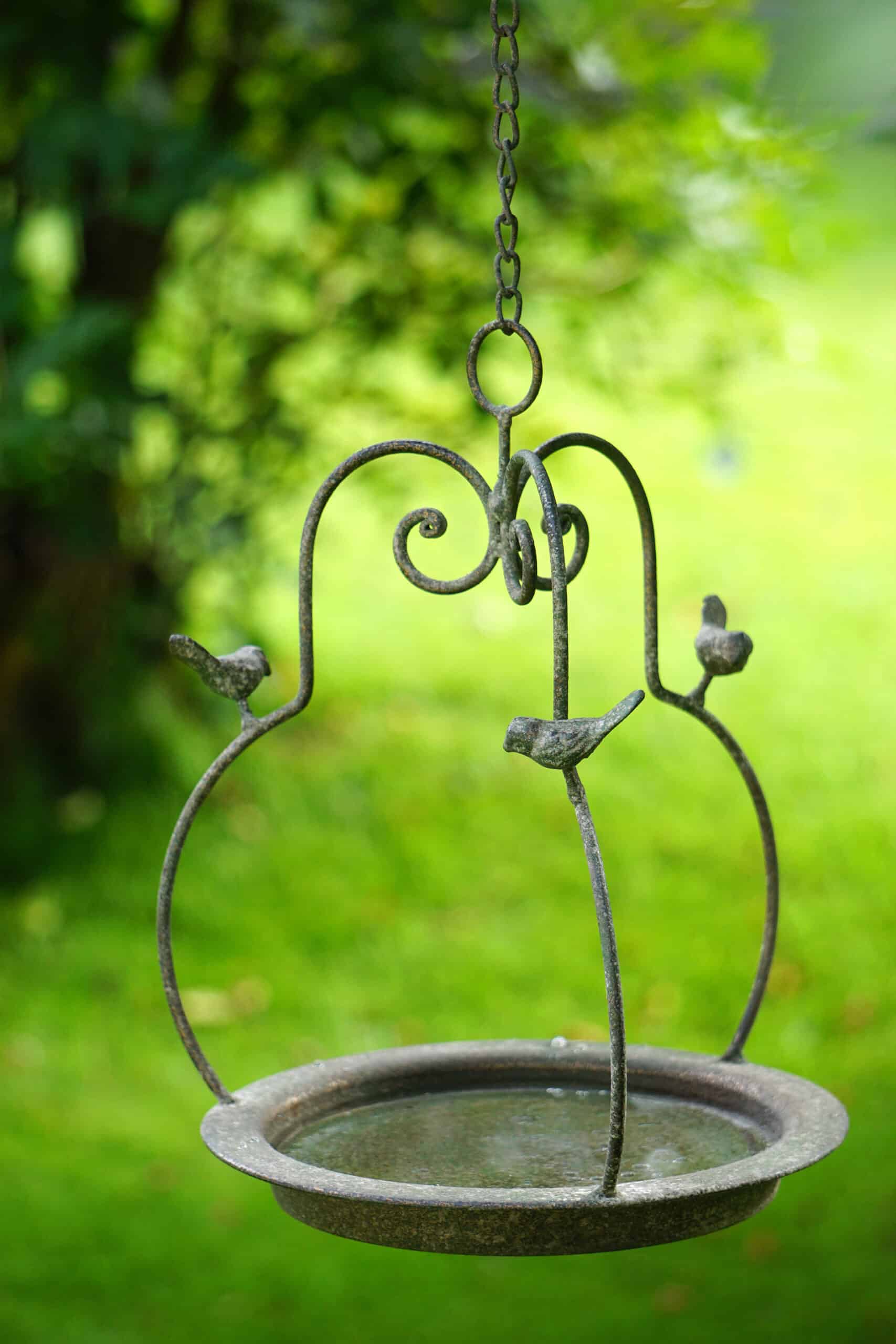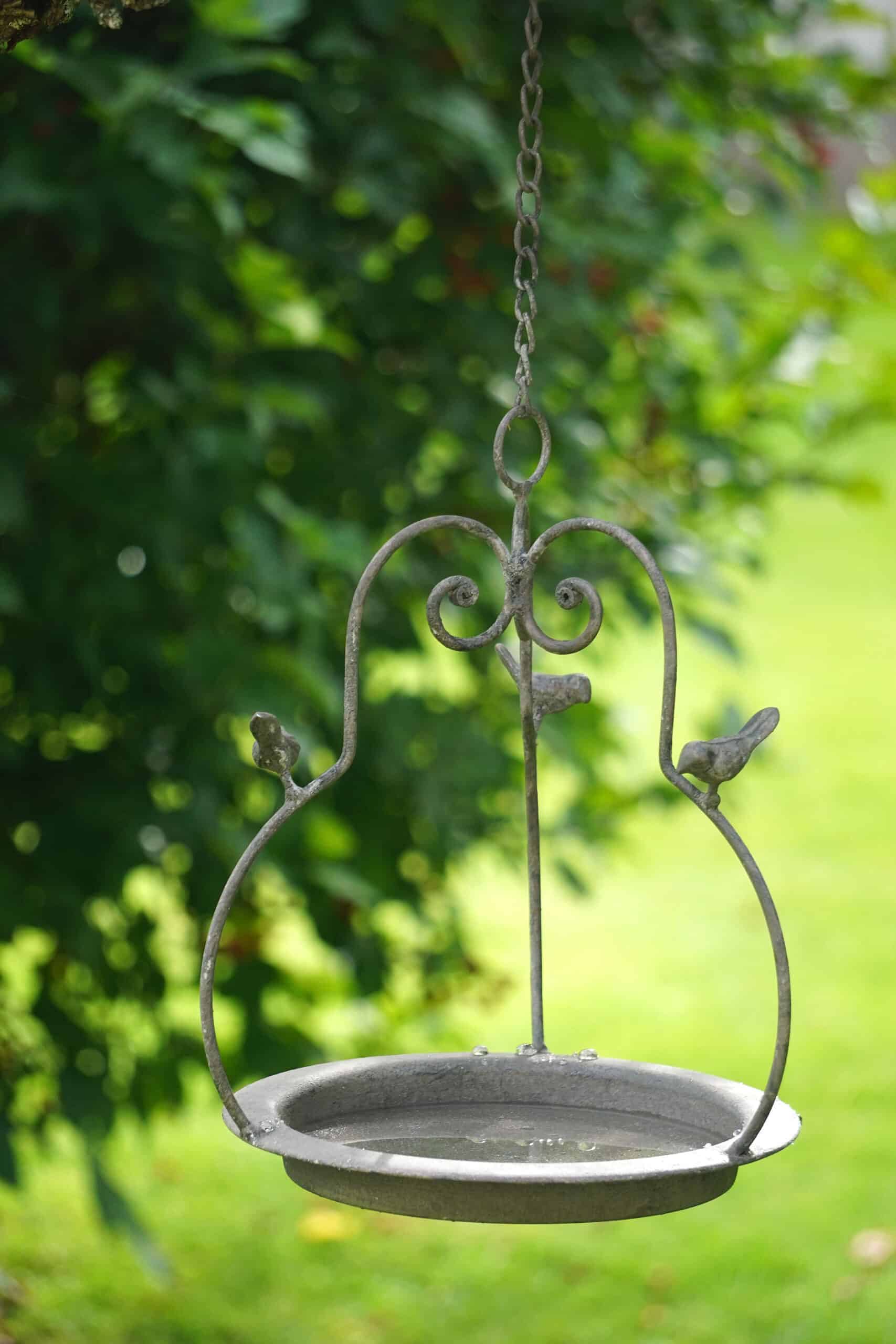 Hängande fågelbad med sirliga detaljer och fina små fåglar. Perfekt att hänga i ett träd i trädgården. Tillverkat i metall.